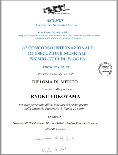 『パドヴァ国際音楽コンクール』で2名の生徒さんが共に1位を受賞、